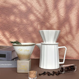 — 採用優質白色陶瓷製成的咖啡濾壺,搭配陶瓷濾杯使用,讓手沖咖啡過程更加流暢順利,能充分展現咖啡豆的香氣與風味。